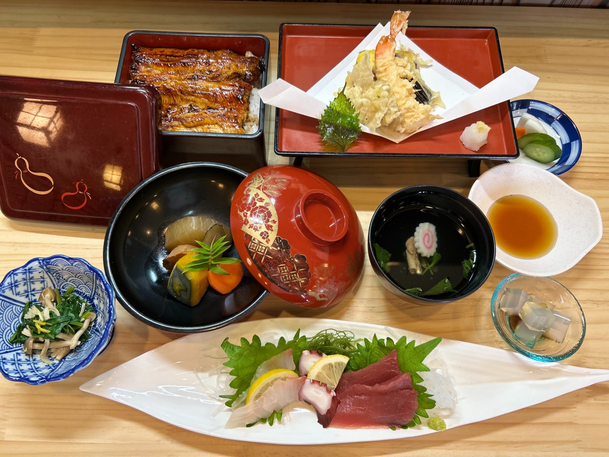 梅コース 前菜・煮物・天ぷら・お刺身・うな重(並)・お椀・デザート